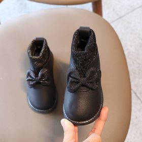 New Little Girl Boots Nice Knitted Shallow Slip On Fur Boots for Kids Princess Glitter Butterfly-knot Platform Boots Baby E07242 (Size: 26, Color: BLACK)