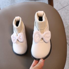 New Little Girl Boots Nice Knitted Shallow Slip On Fur Boots for Kids Princess Glitter Butterfly-knot Platform Boots Baby E07242 (Size: 26, Color: Beige)
