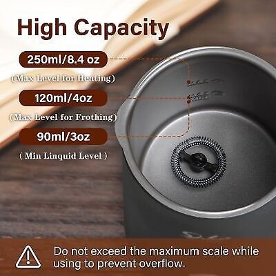 4 in 1 Coffee Frother: The 4-in-1 electric milk frother creates cold foam, heat milk, light foam, and thick foam for your latte, cappuccino, macchiato, iced mocha, and more, which can meet your multiple needs at the same time. You can DIY coffee drinks at home and office, enjoy a different experienceCapacity: Milk heater can heat up to 250ml/8.4oz milk for delicious latte or chocolate milk, or froth up to 120ml/4oz foam for cappuccino or macchiato at a time, which is perfect for treating your family and friendsEasy to Use: This milk frother can froth milk quickly in 1-2 minute, compared to a hand-held milk frother, the automatic one can help you free your hands by pressing the button. The matching lid can prevent the milk from spilling out and can also reduce the noise very wellSimple to Clean: Adopting superior 304 stainless steel material, the internal non-stick surface make it easy to clean. And the large opening makes it easier to wipe away the residue, perfectly saving your timePackage includes: 1 pack 4-in-1 electric milk frother, one whisk for heating milk and the other for heating and frothing