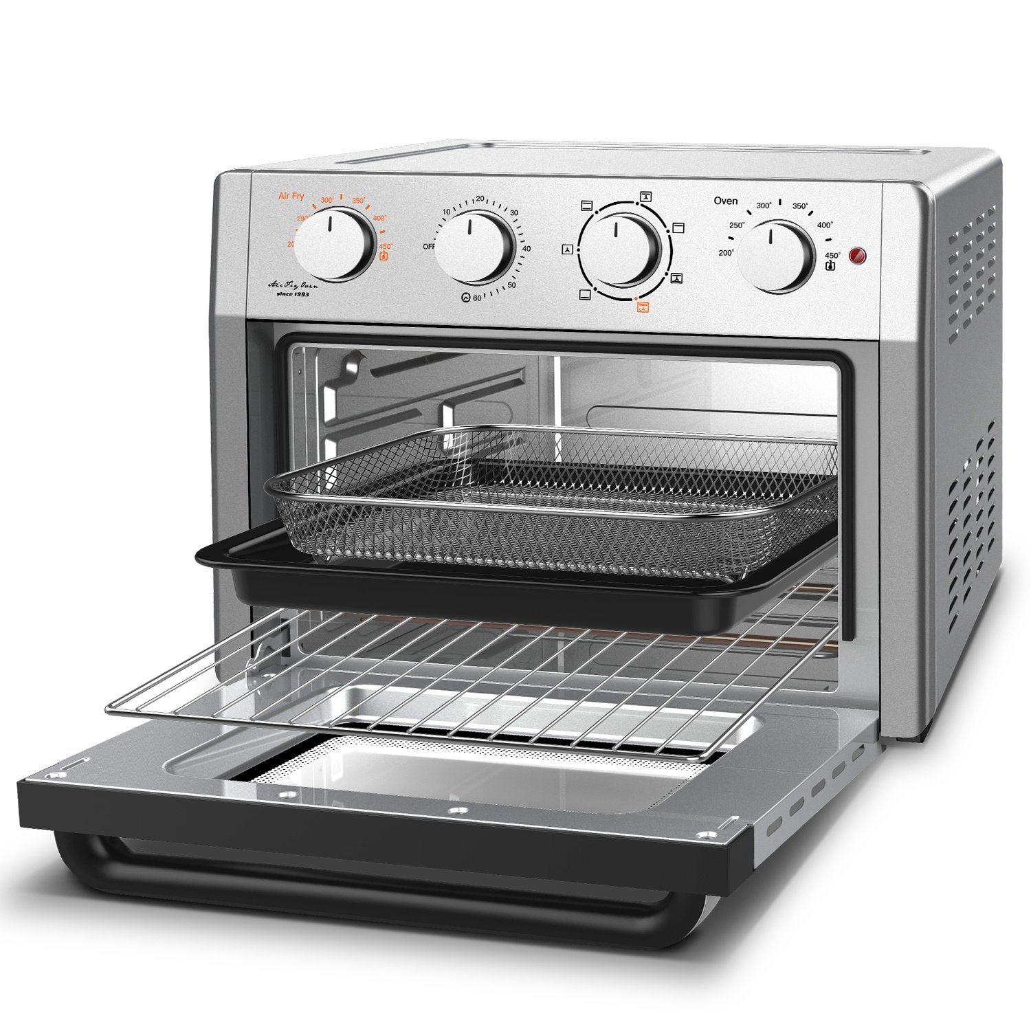 MULTI-FUNCTION Toaster Oven - This air fryer toaster oven includes 7 versatile presets: Air Fry, Toast/Bake, Roast, Broil, Defrost, Convection Broil, and Grill. All-in-One Air Fryer Oven.And you will get: lovely E- Recipes and accessories(Air fryer basket, oven rack, baking pan, and drip tray).