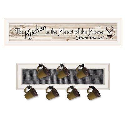 V431-MPH-226G 'Kitchen is the Heart of the Home' a 2 piece grouping of white framed pieces(33x8 Kitchen framed print & a 27x8 Mug Rack(mugs not included) with 7 pegs for you to hang: mugs, keys, towels, string of double hung candles. The beautiful framed print: 'Kitchen is the Heart of the Home' remains on the top selling list. The print invites family and friends to come in, sit down and relax in your Kitchen. Print has a protective, textured finish so no glass is needed. The print arrives ready to hang. Made in the USA by skilled American workers.•Textured Artwork with a 'rolled on' acid free acrylic coating to create a canvas painting effect. No glass is necessary.•Surface of the print has a fade resistant coating.•Arrives Ready to Hang•Woman Owned Business (WBE)•Handmade in the USA•Decorative Moulding adds natural beauty to the framed art.