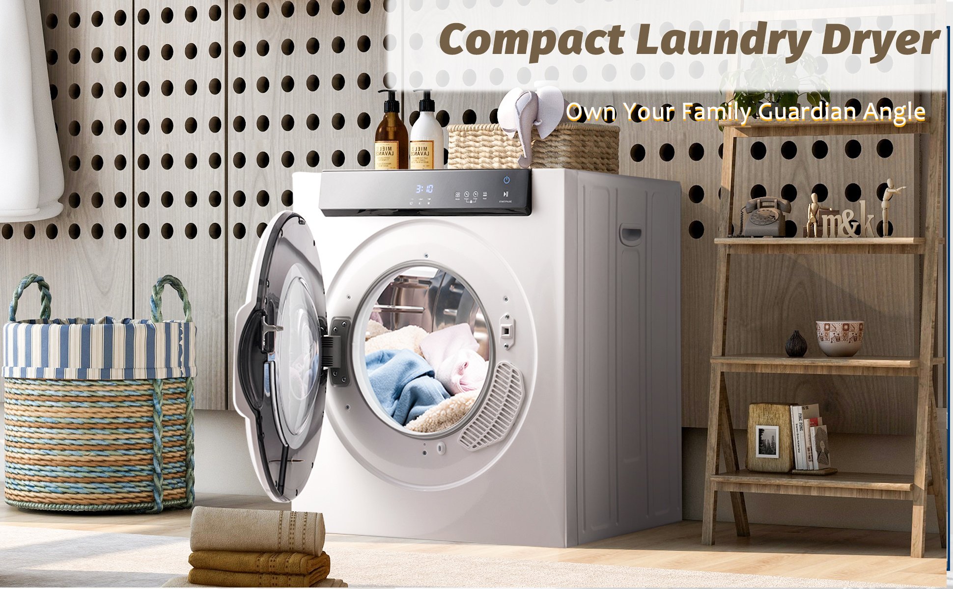 3.As part of your delicate appliances, this laundry dryer is quiet and reliable. You can use it to dry your clothes at any time. Through the smart touch screen, you can enjoy precise timer options and choose more custom drying amounts according to your needs. The simple and compact appearance can perfectly blend into your furnishing background.