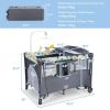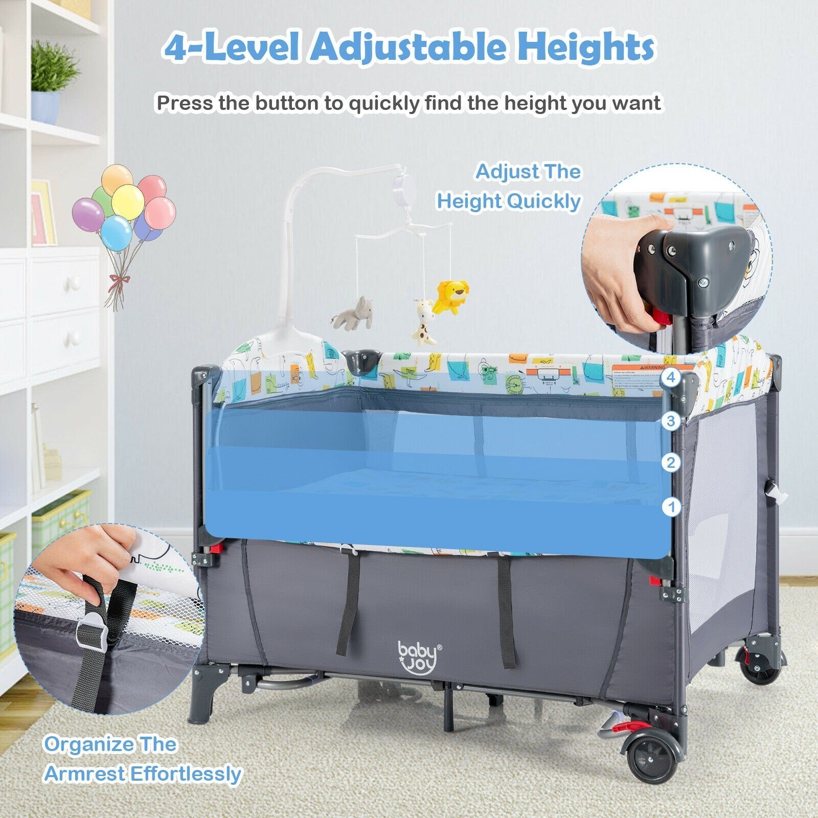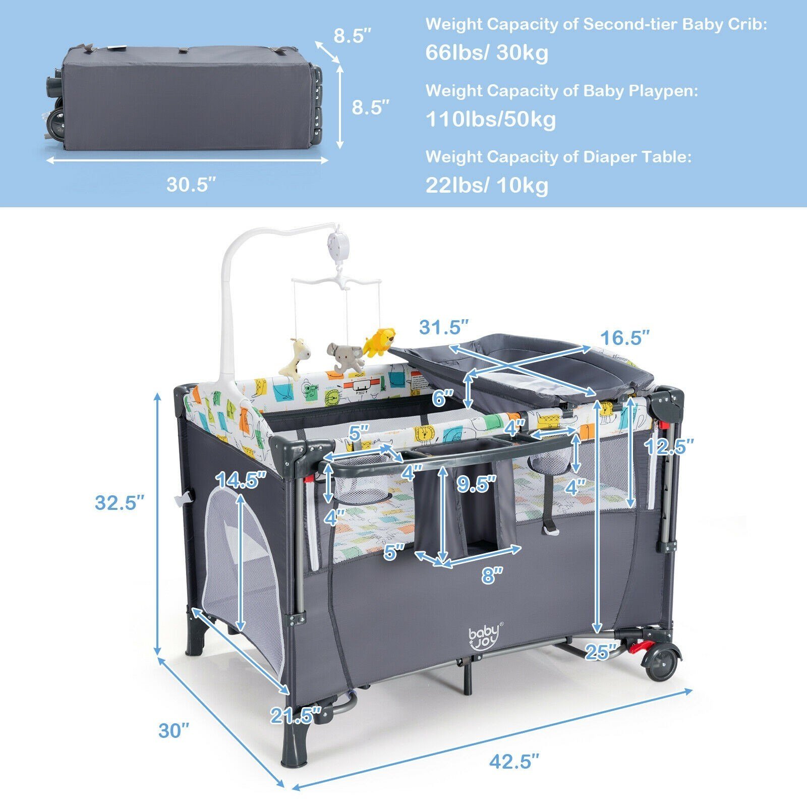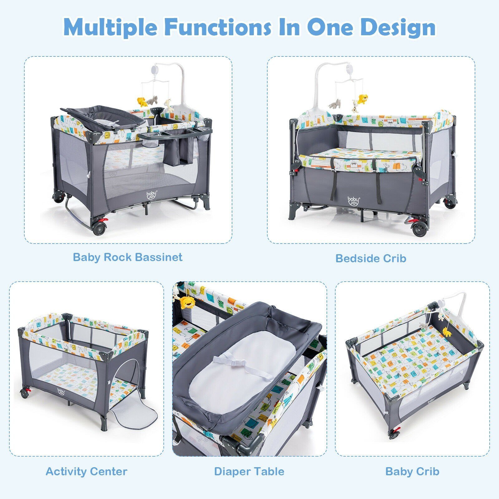 Various functions such as a double-layer baby crib, a spacious activity center, a convenient diaper changing table, a practical baby rock bassinet, and an easy-to-set bedside crib can be realized. The 4-level adjustable height adjustments allow you to freely choose the height you want. The storage tray can hold diapers, baby bottles, tissues, and other items to bring you more convenience. The hanging toy with a music box and rotating function can attract children's attention and get more smiles. The U-shaped diaper changing table with a safety belt is not only waterproof but also safe to use. The extra straps help to connect and fix the baby crib and adult bed to improve stability and safety. The wheels with brakes can not only move easily but also remain stable when stopped. With detailed instructions, this care center can be installed in a short time.