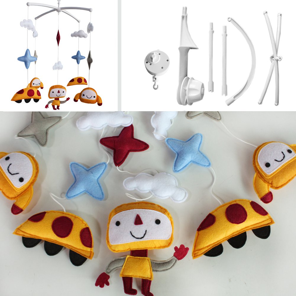 Each package contains a Baby Crib Mobile Bed Bell Holder Arm Bracket and a Wind-up Music Box and toys. This handmade baby crib mobile plays light music to help your baby easily fall asleep. Easy operation and convenient to use, it will rotate while playing music. Each mobile plays Only One soothing pure and light song. Keep baby calm and happy, with this mesmerizing mobile. It is an essential product for baby and nursery. The toys are made from nonwoven fabric. Please note: Can be customized, please contact us about the colors you like, otherwise we will ship the item in original color to you.