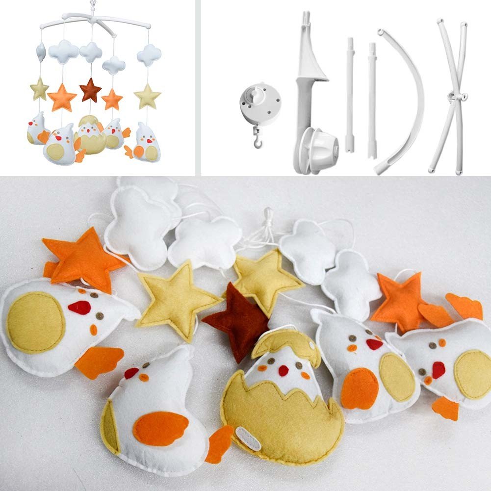 This handmade baby crib mobile plays light music to help your baby easily fall asleep. Easy operation and convenient to use, it will rotate while playing music. Each bed bell plays Only One soothing pure and light song. Keep baby calm and happy. It is an essential product for baby and nursery. Perfect for baby shower or mom-to-be gift for baby's nursery. Baby's nursery room decoration. The toys are made from nonwoven fabric.