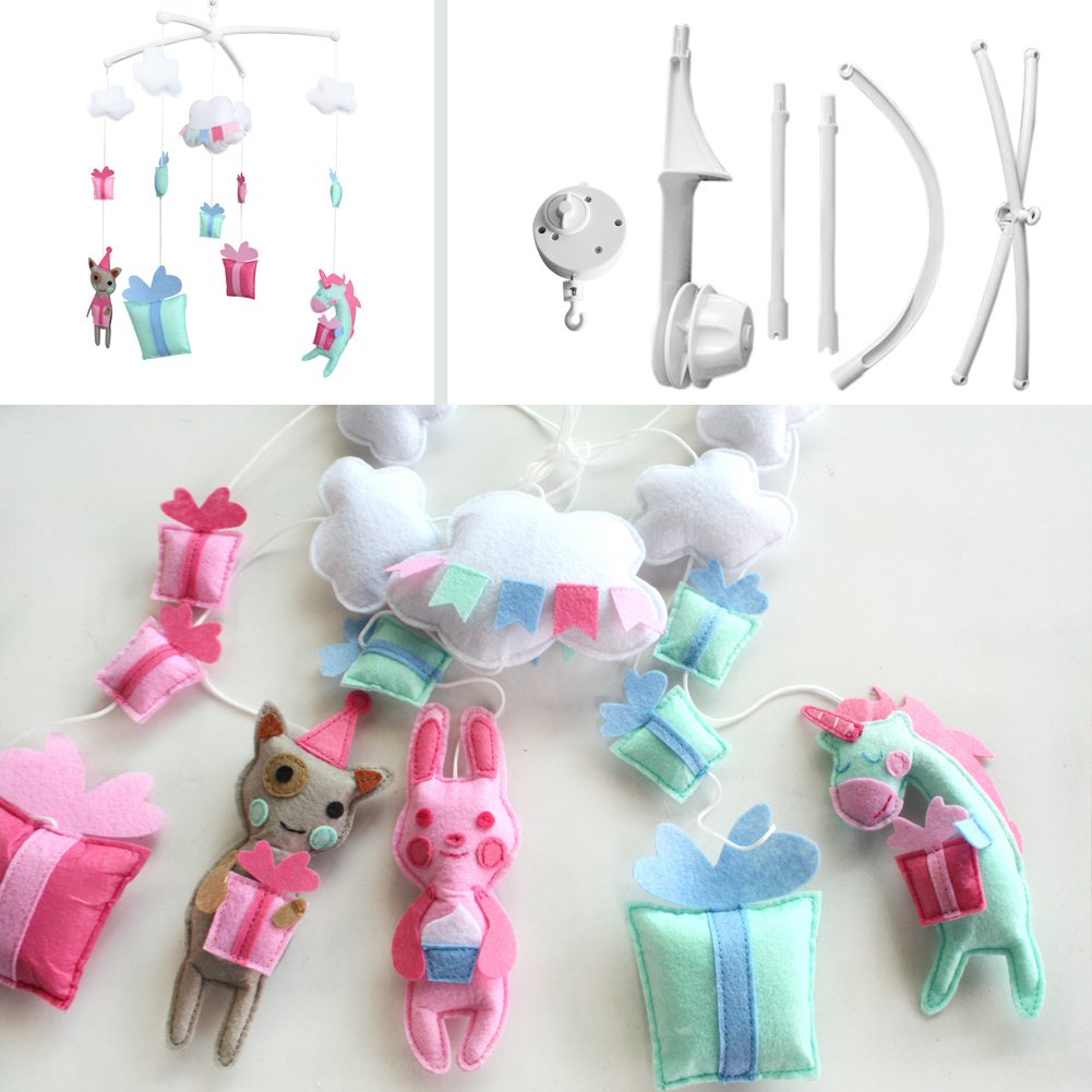 Each package contains a Baby Crib Mobile Bed Bell Holder Arm Bracket and a Wind-up Music Box and toys. This handmade baby crib mobile plays light music to help your baby easily fall asleep. Easy operation and convenient to use, it will rotate while playing music. Each mobile plays Only One soothing pure and light song. Keep baby calm and happy, with this mesmerizing mobile. It is an essential product for baby and nursery. The toys are made from nonwoven fabric. Please note: Can be customized, please contact us about the size you need, otherwise we will ship the item in original size to you.