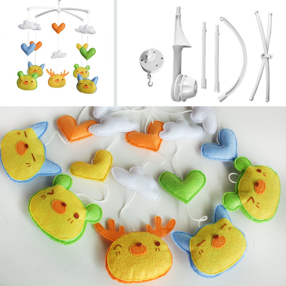 This handmade baby crib mobile plays light music to help your baby easily fall asleep. Easy operation and convenient to use; it will rotate while playing music. Each bed bell plays Only One soothing pure and light song. Keep baby calm and happy. It is an essential product for baby and nursery. Perfect for baby shower or mom-to-be gift for baby's nursery. Baby's nursery room decoration. The toys are made from nonwoven fabric.
