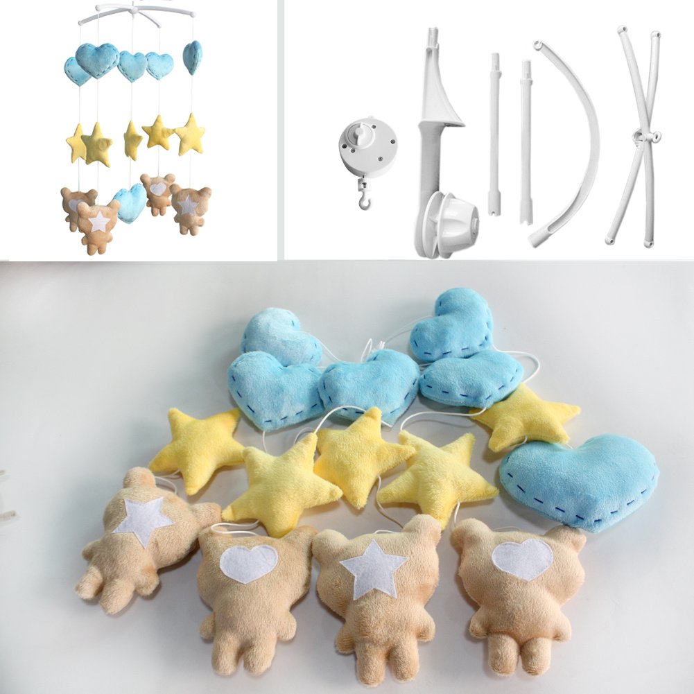 This handmade baby crib mobile plays light music to help your baby easily fall asleep. Easy operation and convenient to use; it will rotate while playing music. Each bed bell plays Only One soothing pure and light song. Keep baby calm and happy. It is an essential product for baby and nursery. Perfect for baby shower or mom-to-be gift for baby's nursery. Baby's nursery room decoration. The toys are made from nonwoven fabric.