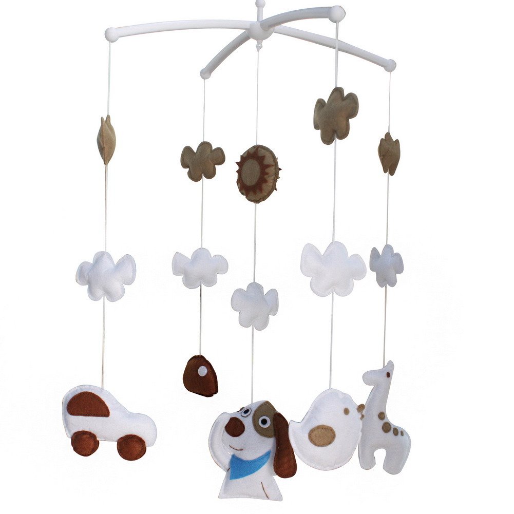This handmade baby crib mobile plays light music to help your baby easily fall asleep. Easy operation and convenient to use; it will rotate while playing music. Each bed bell plays Only One soothing pure and light song. Keep baby calm and happy. It is an essential product for baby and nursery. Perfect for baby shower or mom-to-be gift for baby's nursery. Baby's nursery room decoration. The toys are made from nonwoven fabric.