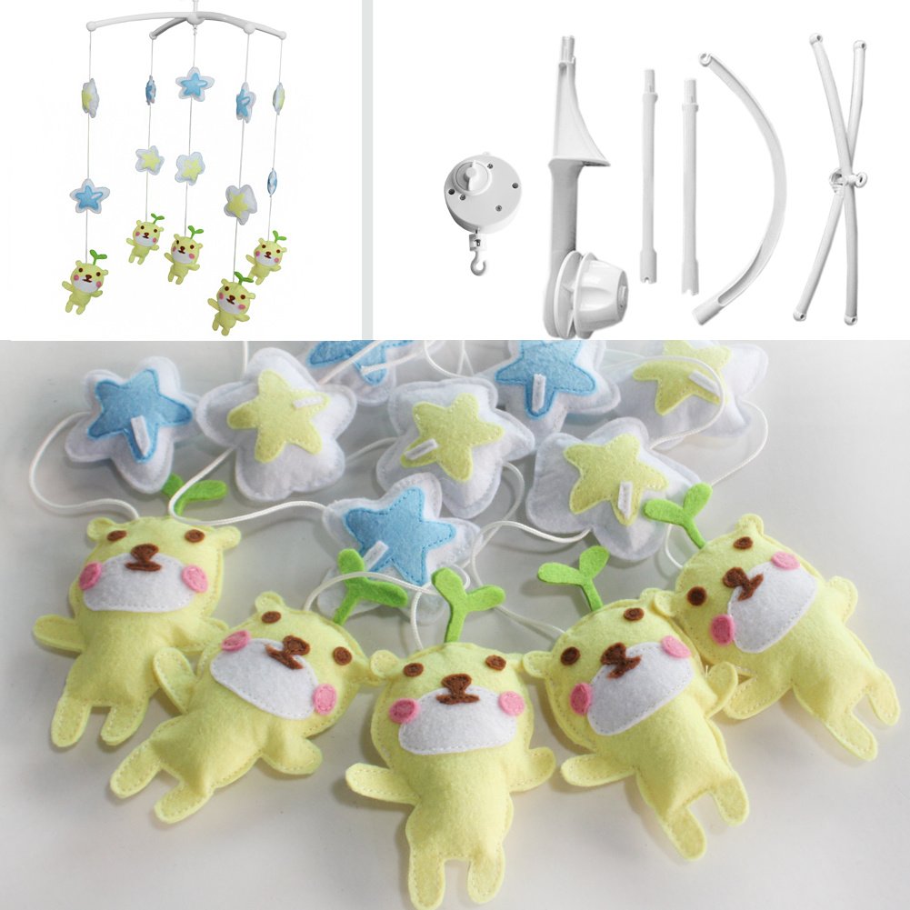 This handmade baby crib mobile plays light music to help your baby easily fall asleep. Easy operation and convenient to use; it will rotate while playing music. Each bed bell plays Only One soothing pure and light song. Keep baby calm and happy. It is an essential product for baby and nursery. Perfect for baby shower or mom-to-be gift for baby's nursery. Baby's nursery room decoration. The toys are made from nonwoven fabric.
