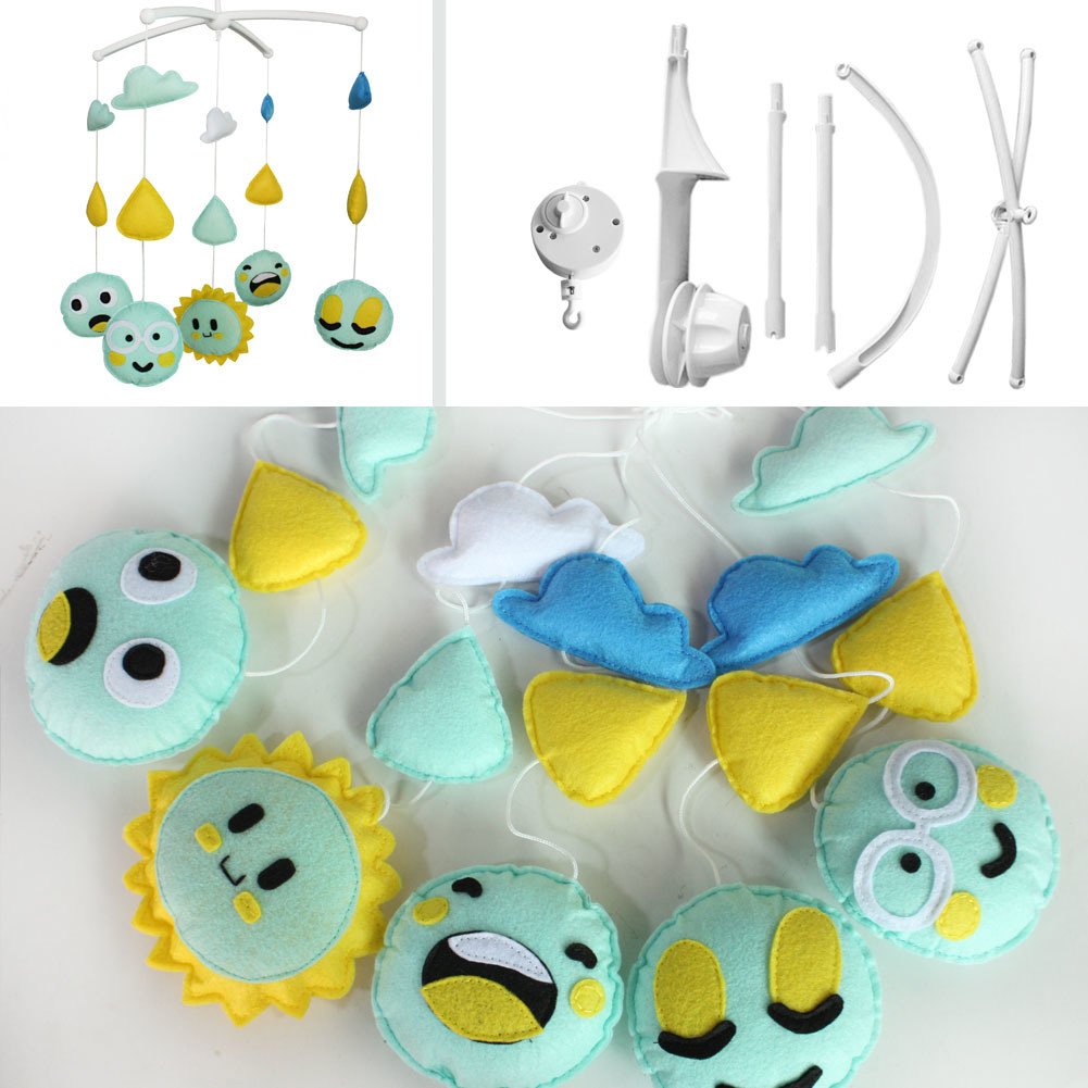 This handmade baby crib mobile plays light music to help your baby easily fall asleep. Easy operation and convenient to use; it will rotate while playing music. Each bed bell plays Only One soothing pure and light song. Keep baby calm and happy. It is an essential product for baby and nursery. Perfect for baby shower or mom-to-be gift for baby's nursery. The toys are made from nonwoven fabric.