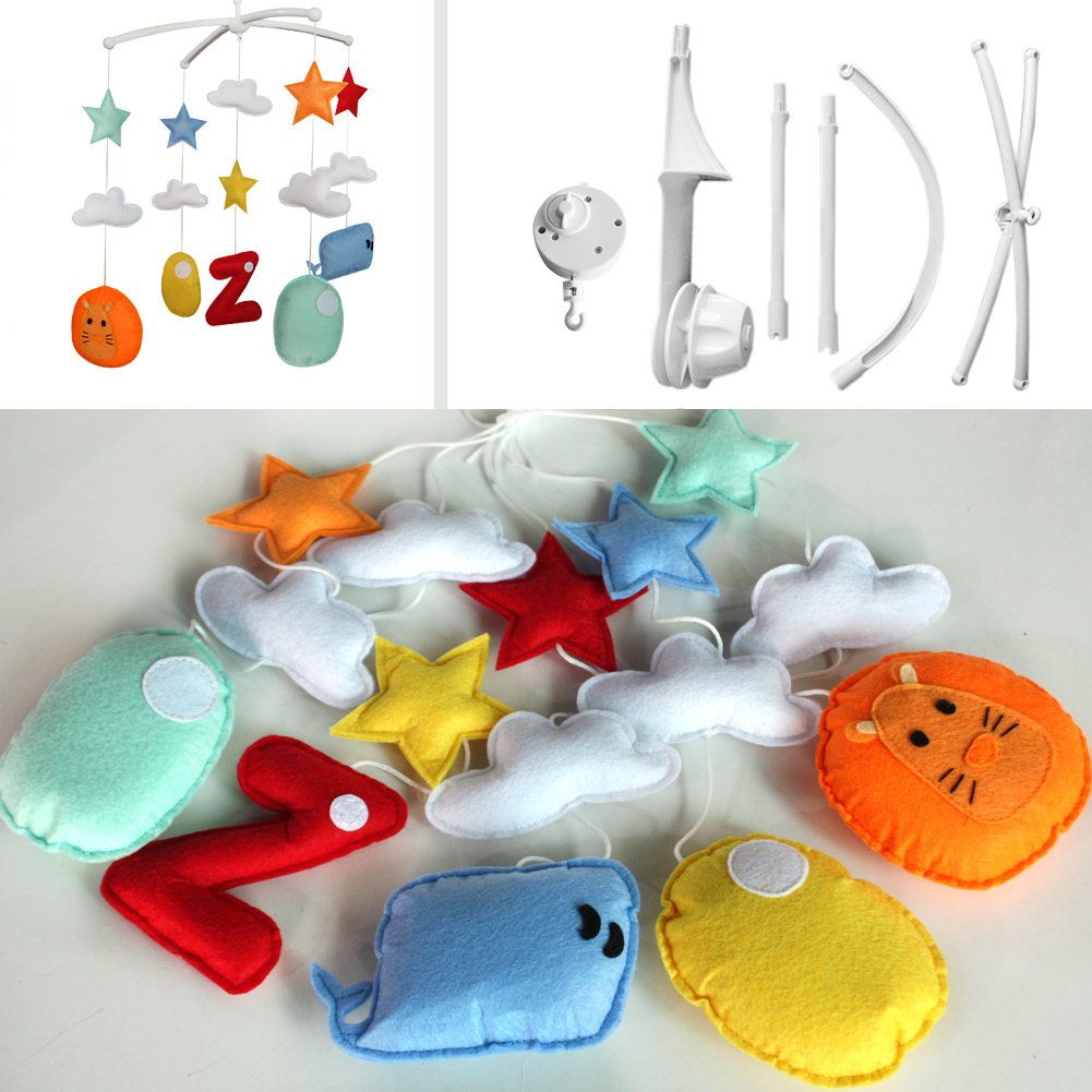This handmade baby crib mobile plays light music to help your baby easily fall asleep. Easy operation and convenient to use; it will rotate while playing music. Each bed bell plays Only One soothing pure and light song. Keep baby calm and happy. It is an essential product for baby and nursery. Perfect for baby shower or mom-to-be gift for baby's nursery. Baby's nursery room decoration. The toys are made from nonwoven fabric.