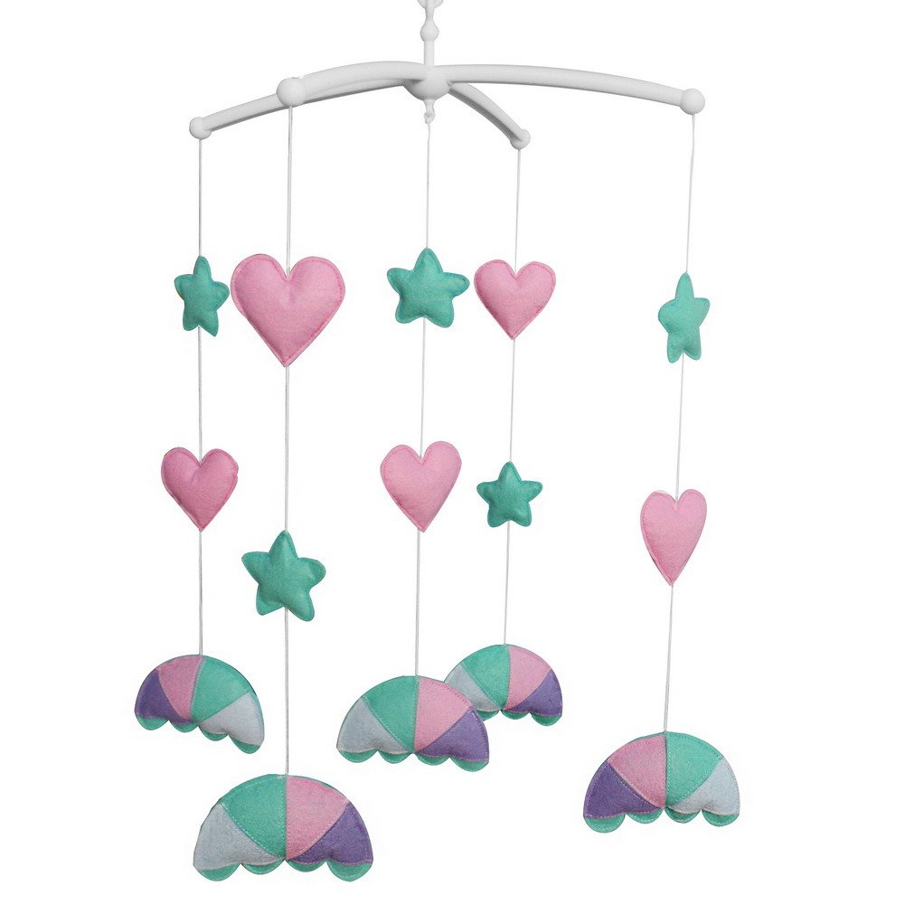 This handmade baby crib mobile plays light music to help your baby easily fall asleep. Easy operation and convenient to use; it will rotate while playing music. Each bed bell plays Only One soothing pure and light song. Keep baby calm and happy. It is an essential product for baby and nursery. Perfect for baby shower or mom-to-be gift for baby's nursery. The toys are made from nonwoven fabric.