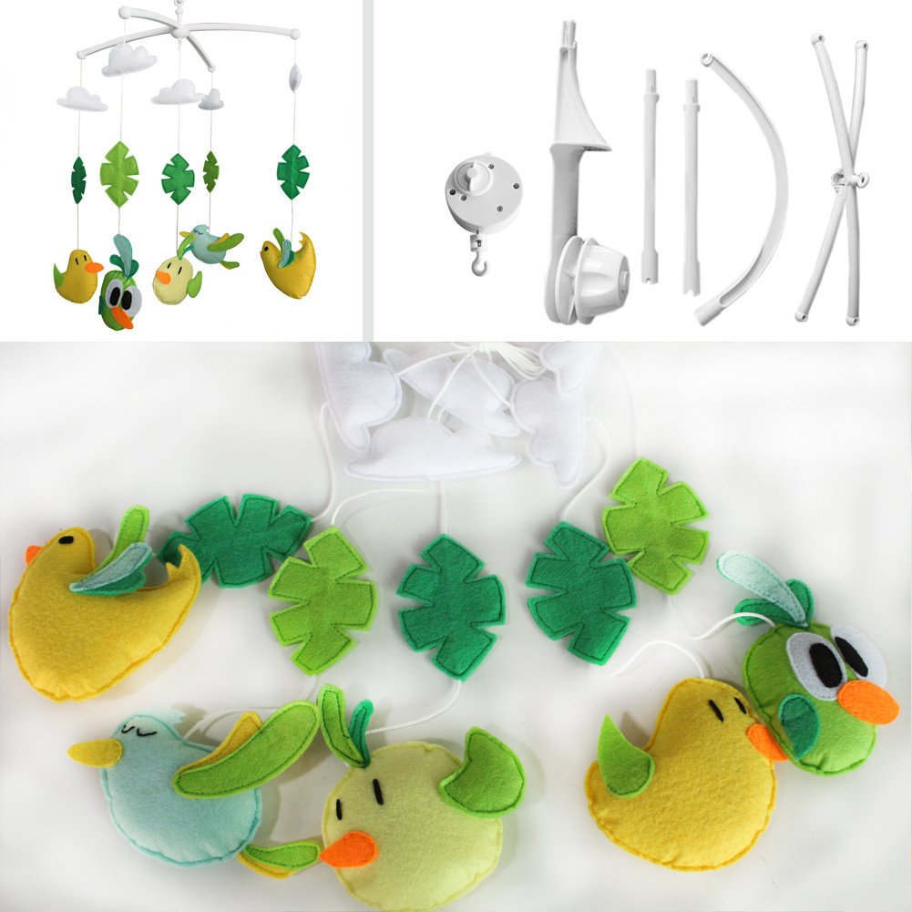 This handmade baby crib mobile plays light music to help your baby easily fall asleep. Easy operation and convenient to use; it will rotate while playing music. Each bed bell plays Only One soothing pure and light song. Keep baby calm and happy. It is an essential product for baby and nursery. Perfect for baby shower or mom-to-be gift for baby's nursery. Baby's nursery room decoration. The toys are made from nonwoven fabric.