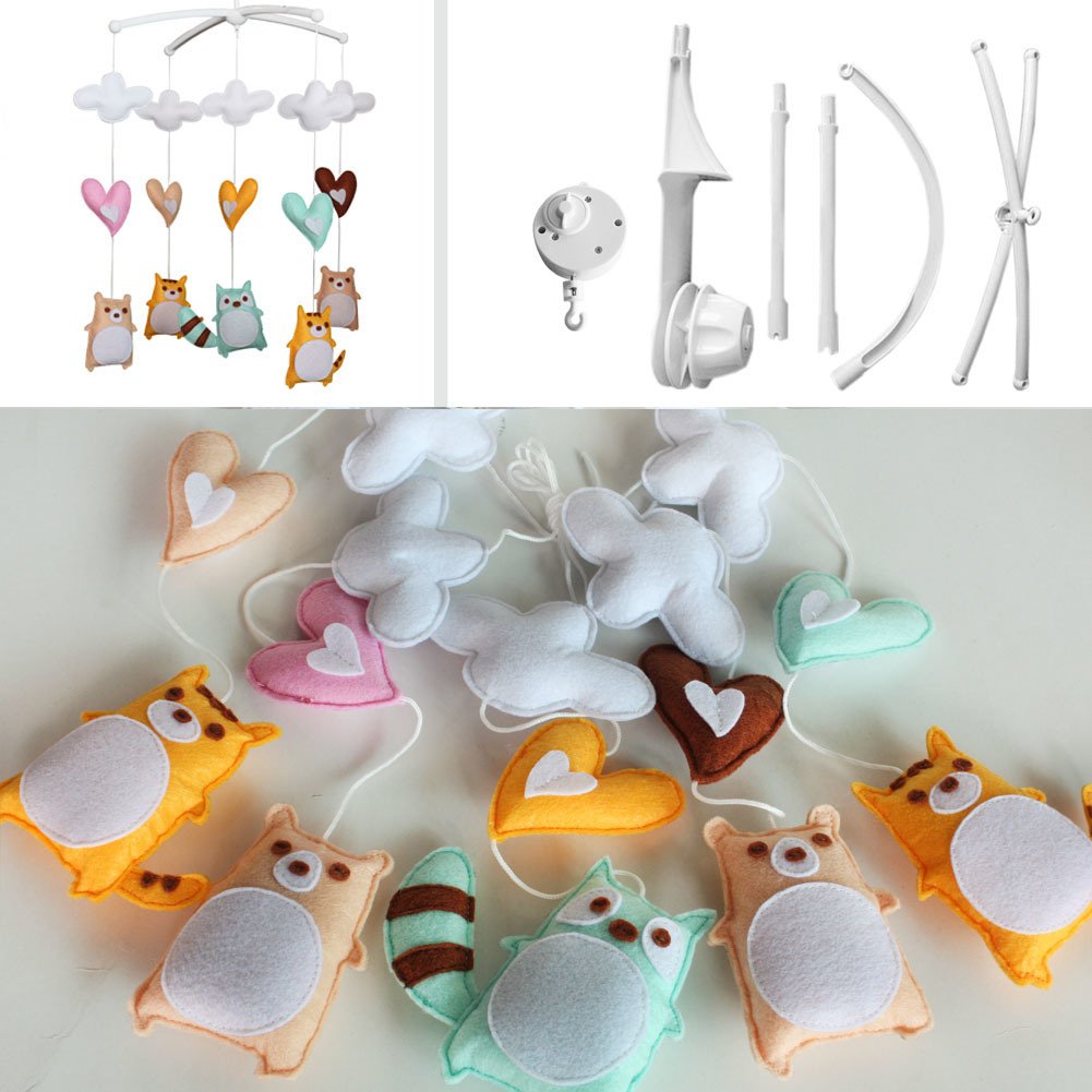 This handmade baby crib mobile plays light music to help your baby easily fall asleep. Easy operation and convenient to use; it will rotate while playing music. Each bed bell plays Only One soothing pure and light song. Keep baby calm and happy. It is an essential product for baby and nursery. Perfect for baby shower or mom-to-be gift for baby's nursery. Baby's nursery room decoration. The toys are made from nonwoven fabric.