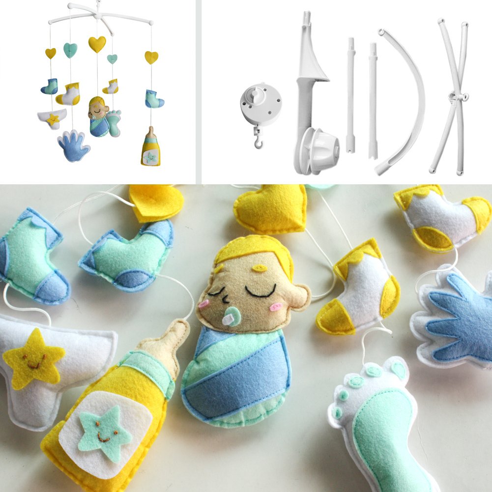 This handmade baby crib mobile plays light music to help your baby easily fall asleep. Easy operation and convenient to use; it will rotate while playing music. Each bed bell plays Only One soothing pure and light song. Keep baby calm and happy. It is an essential product for baby and nursery. Perfect for baby shower or mom-to-be gift for baby's nursery. Baby's nursery room decoration. The toys are made from nonwoven fabric.