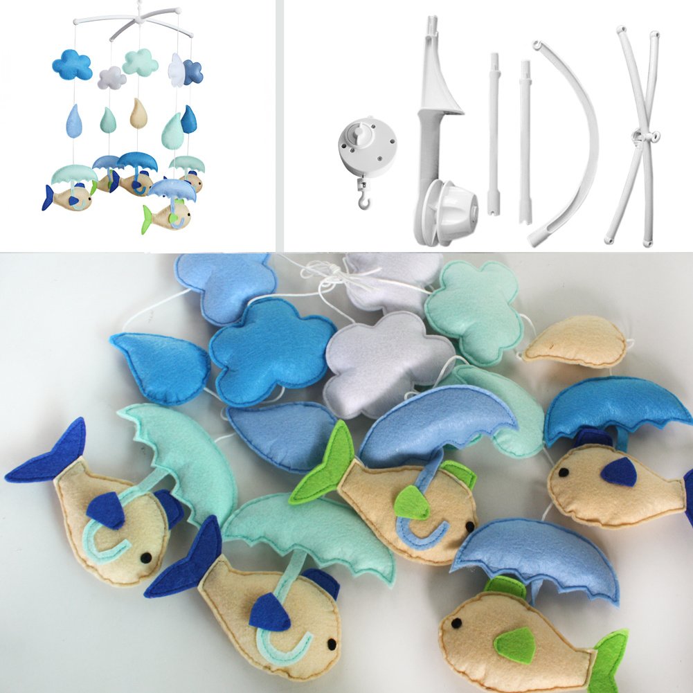 This handmade baby crib mobile plays light music to help your baby easily fall asleep. Easy operation and convenient to use; it will rotate while playing music. Each bed bell plays Only One soothing pure and light song. Keep baby calm and happy. It is an essential product for baby and nursery. Perfect for baby shower or mom-to-be gift for baby's nursery. Baby's nursery room decoration. The toys are made from nonwoven fabric.