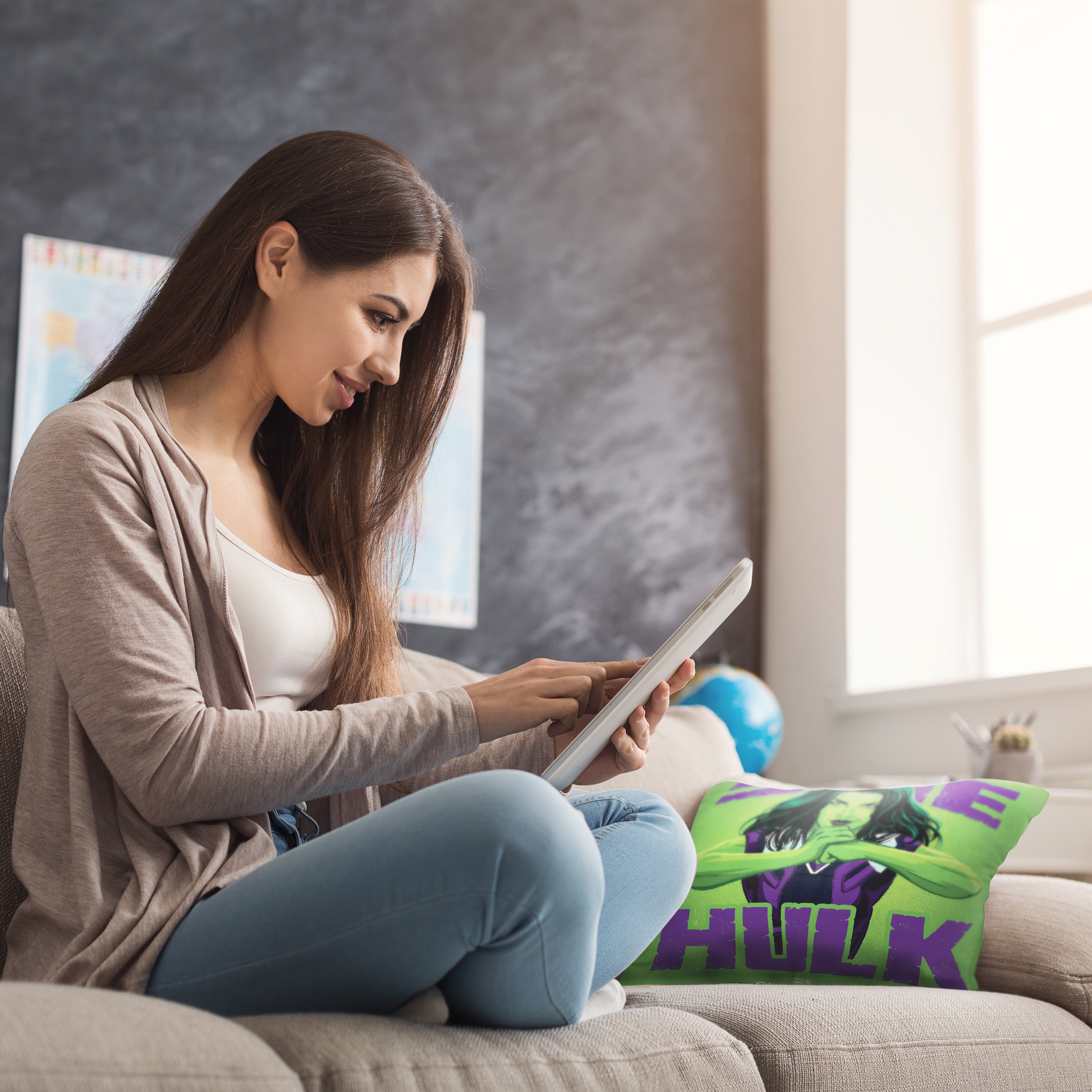Snuggle up in style with this Marvel She Hulk "She Hulk Smash" soft and luxurious pillow. Measuring 18"W x 18"L, it's the perfect size to add an extra layer of coziness to your couch, bed, or any area in your home. Made with 100% polyester, this pillow is designed to be incredibly soft and comfortable.