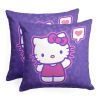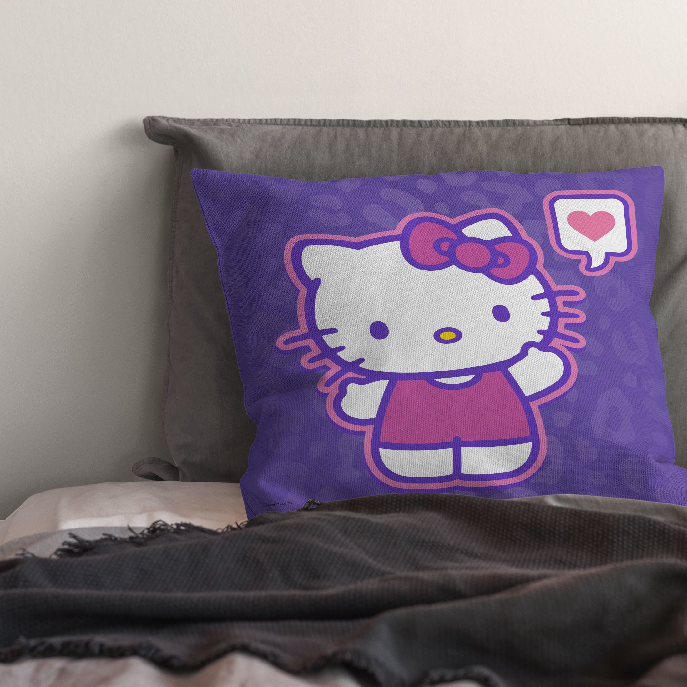 Features Hello Kitty and a speech bubble with a heart inside on a purple background