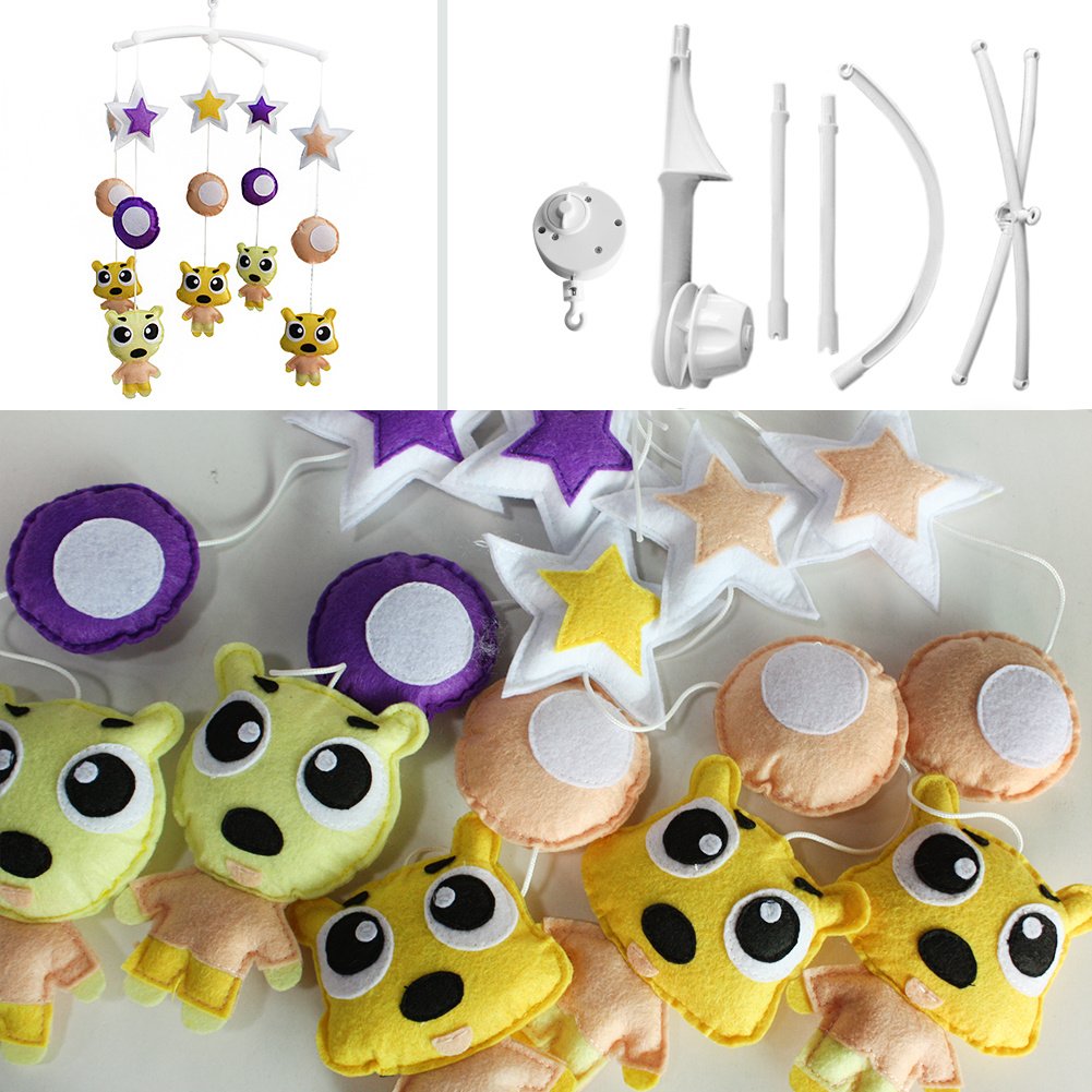 This handmade baby crib mobile plays light music to help your baby easily fall asleep. Easy operation and convenient to use; it will rotate while playing music. Each bed bell plays Only One soothing pure and light song. Keep baby calm and happy. It is an essential product for baby and nursery. Perfect for baby shower or mom-to-be gift for baby's nursery. Baby's nursery room decoration. The toys are made from nonwoven fabric.