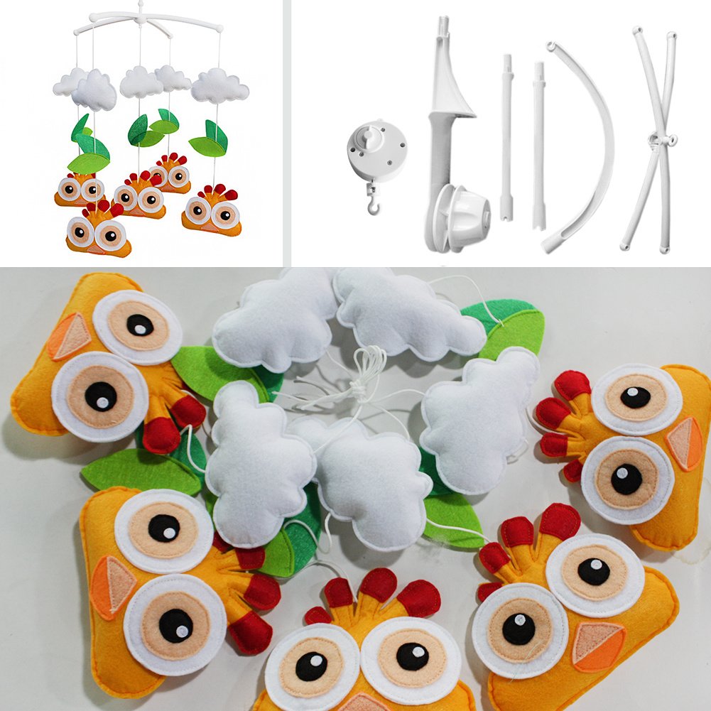 This handmade baby crib mobile plays light music to help your baby easily fall asleep. Easy operation and convenient to use; it will rotate while playing music. Each bed bell plays Only One soothing pure and light song. Keep baby calm and happy. It is an essential product for baby and nursery. Perfect for baby shower or mom-to-be gift for baby's nursery. Baby's nursery room decoration. The toys are made from nonwoven fabric.