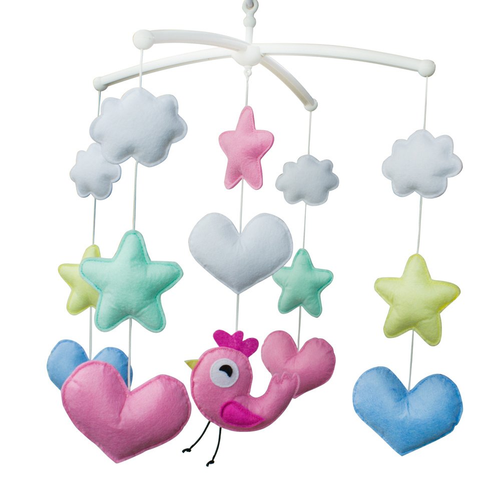 Pink Bird Colorful Stars Hearts White Clouds Handmade Baby Musical Crib Mobile Boys Girls Nursery Hanging Mobile Toy Pink Bird Colorful Stars Hearts White Clouds Handmade Baby Musical Crib Mobile Boys Girls Nursery Hanging Mobile Toy