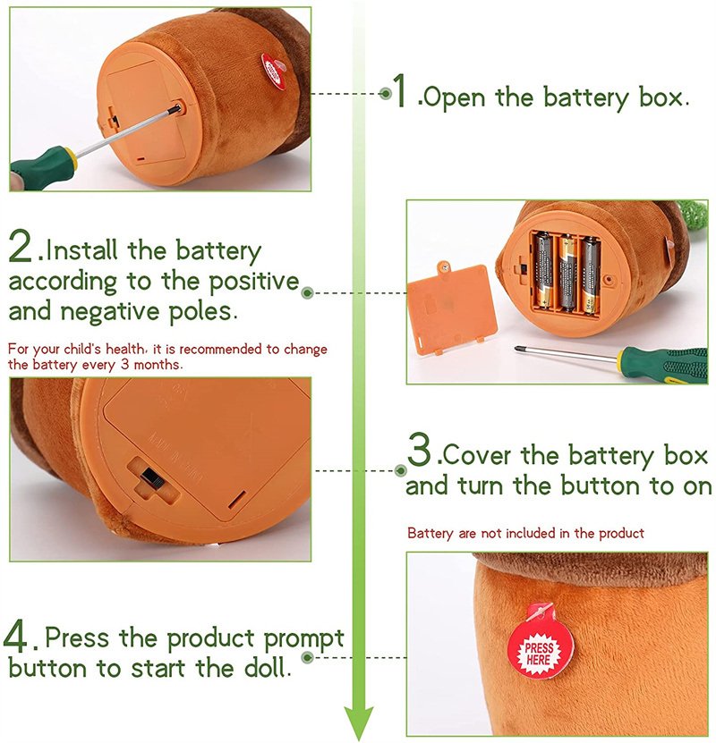 ��When using ordinary carbon batteries; toys may sound stuck and have no sound. If this happens; please replace the batteries. It needs three pieces LR6 AA 1.5V Alkaline batteries to activate; and batteries NOT included in the delivery.