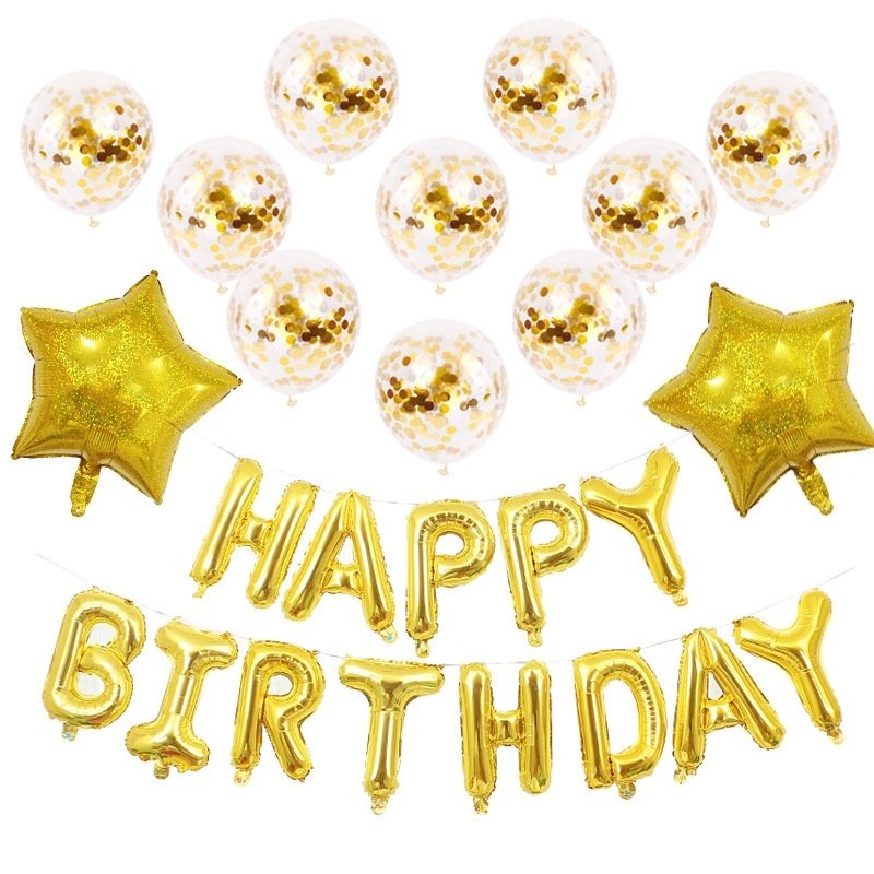 16-inch Hanging Birthday*1Paper balloon*10,18-inch Laser Pentagon Balloon*2Laser ribbon*1